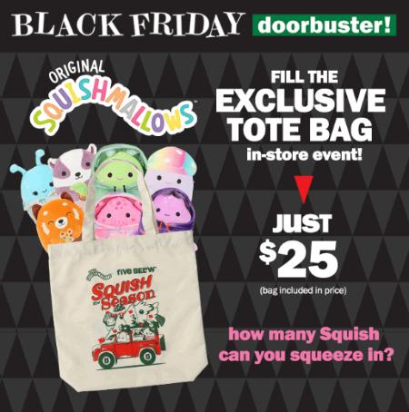 Valid 11/28/25-11/29/25. Limit 10 Squishmallows per customer. Doorbuster bag quantities extremely limited and only while supplies last. Must use the bag provided by the store to receive the promo offer. Customers cannot use any other bag. Discount taken at checkout. Squishmallows must fit completely inside the bag. Bag may not be altered or damaged. Excludes Myster Squishmallows, 16" Squishmallows, 4.5" Seasonal Minis, 3.5" Squishmallows Clips, Pokémon Squishmallows Clips & ALL other Squishmallows merchandise. Other restrictions apply.